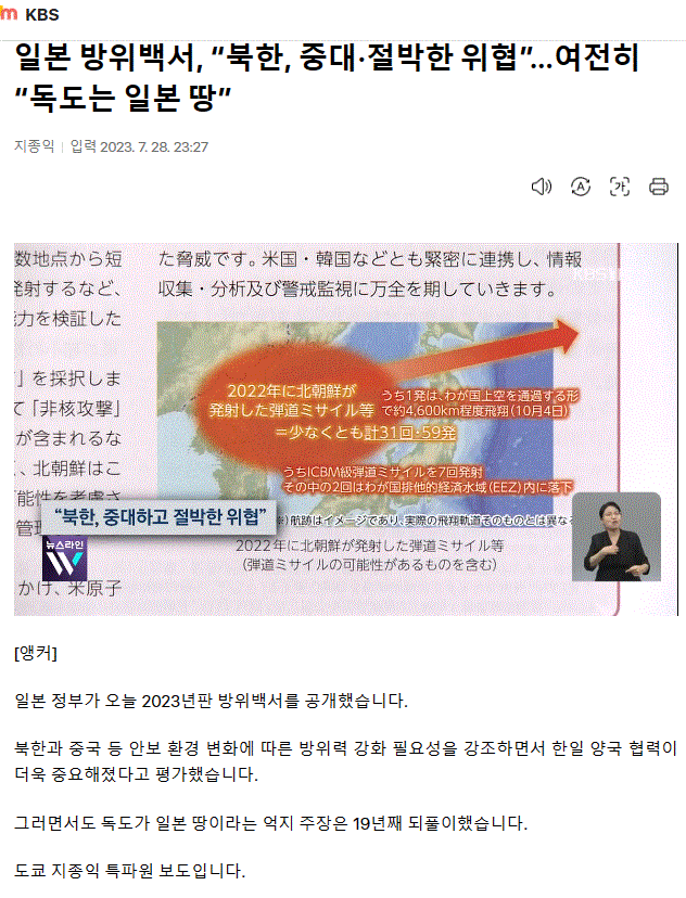 일본 방위백서, “북한, 중대·절박한 위협”…여전히 “독도는 일본 땅”