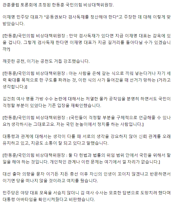 한동훈 "검사독재 있다면 이재명 대표는 감옥에 있을 것"