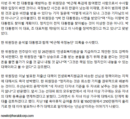 한동훈 “박근혜가 이재명·조국처럼 권력 장악하겠다고 했냐”