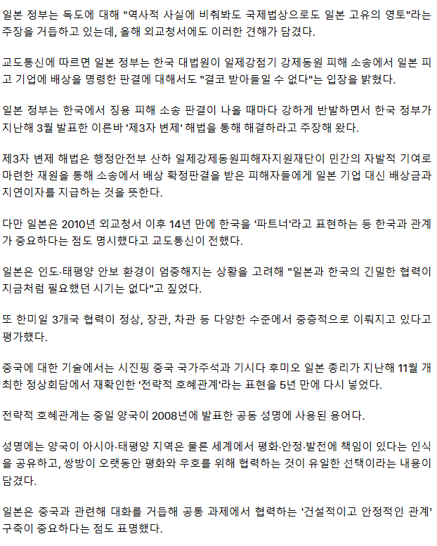 日 외교청서 "독도는 일본 땅…징용 판결 수용 못해"