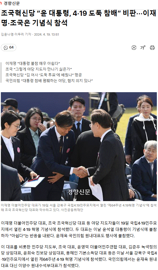 조국혁신당 “윤 대통령, 4·19 도둑 참배” 비판···이재명·조국은 기념식 참석