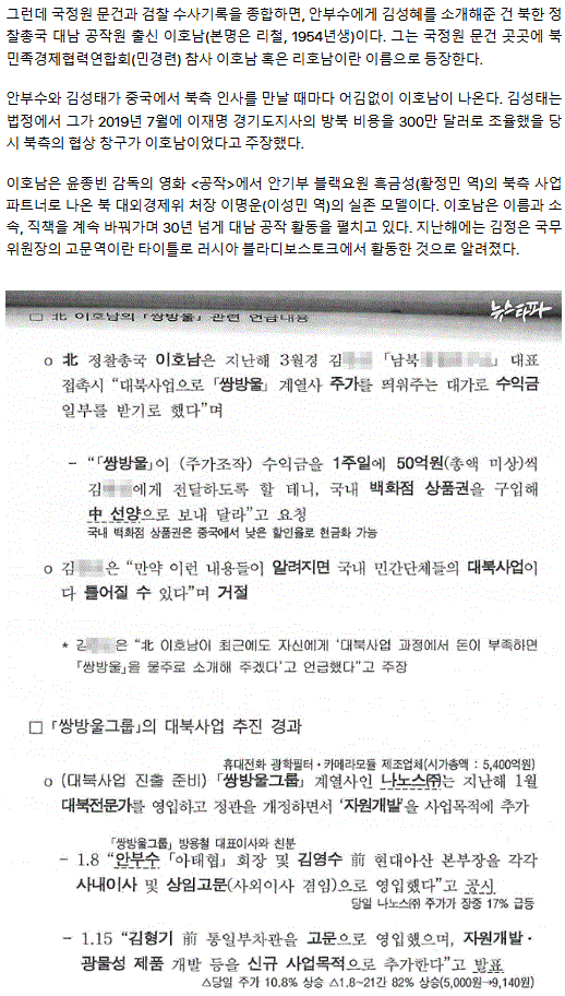 [국정원 문건]② 쌍방울, 北 정찰총국 이호남과 '주가 조작' 공모 정황