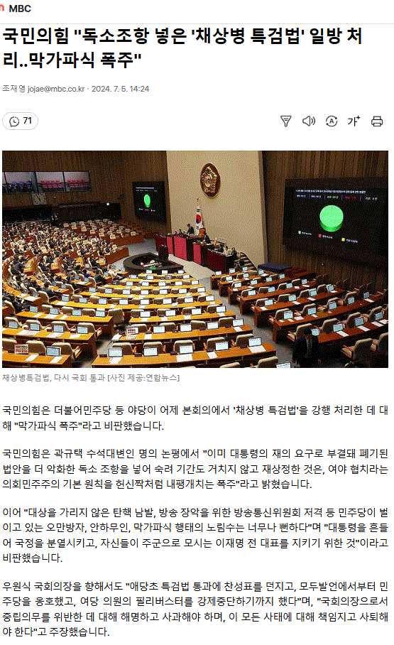 국민의힘 "독소조항 넣은 '채상병 특검법' 일방 처리‥막가파식 폭주"