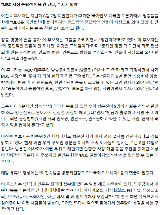[단독] 이진숙 "MBC 차기 사장, 투사가 와야...조선일보 잘하고 있다"