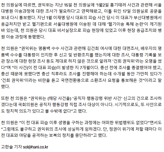 권익위, 이재명 ‘헬기 이송’ 돌연 조사…“김건희 가방은 종결하더니”