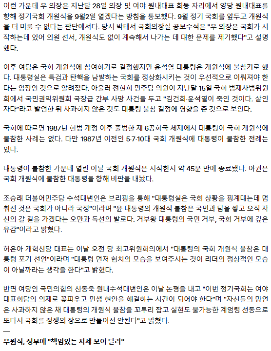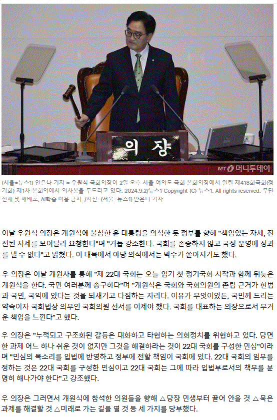 대통령 불참 속 '최장 지각' 개원식··· 우원식 "尹에 개헌 대화 제안"