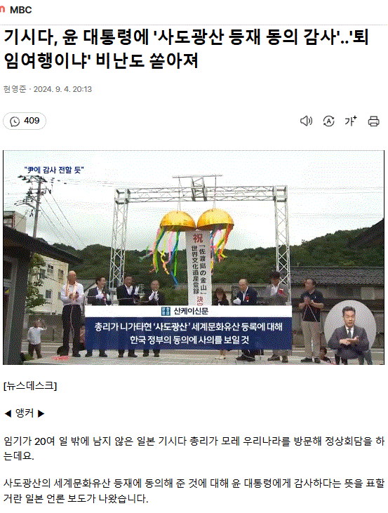 기시다, 윤 대통령에 '사도광산 등재 동의 감사'‥ '퇴임여행이냐' 비난도 쏟아져