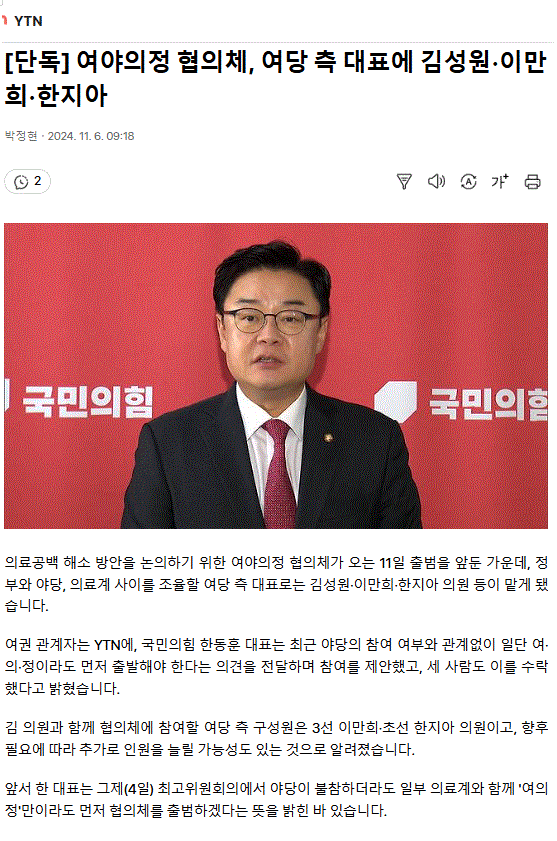 [단독] 여야의정 협의체, 여당 측 대표에 김성원·이만희·한지아