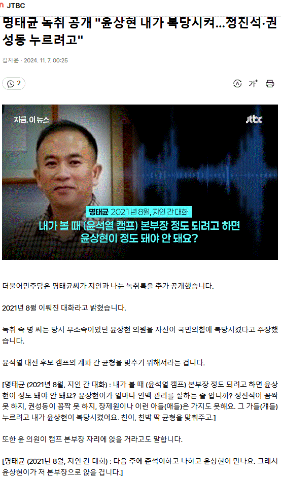 명태균 녹취 공개 "윤상현 내가 복당시켜… 정진석·권성동 누르려고"