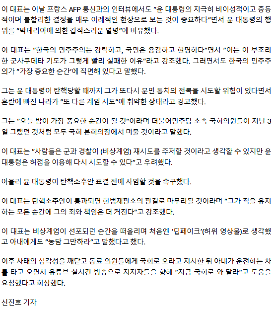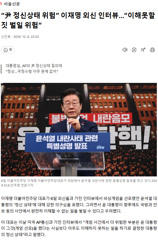 “尹 정신상태 위험” 이재명 외신 인터뷰… “이해못할 짓 벌일 위험”