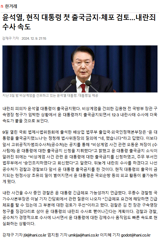 윤석열, 현직 대통령 첫 출국금지·체포 검토… 내란죄 수사 속도