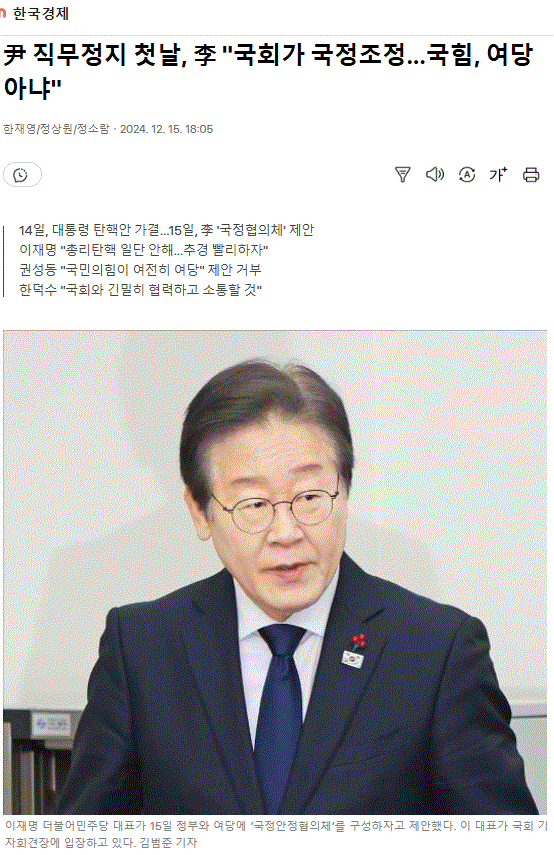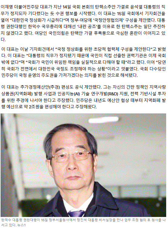 尹 직무정지 첫날, 李 "국회가 국정조정… 국힘, 여당 아냐"