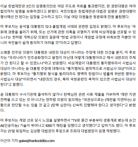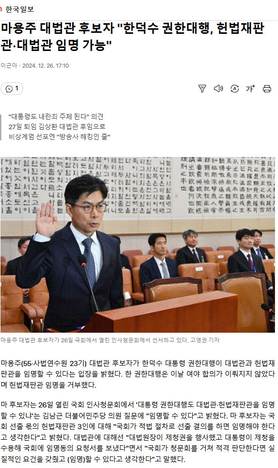 마용주 대법관 후보자 "한덕수 권한대행, 헌법재판관·대법관 임명 가능"