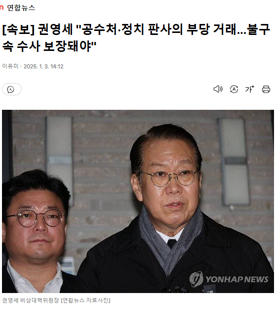 [속보] 권영세 "공수처·정치 판사의 부당 거래… 불구속 수사 보장돼야" ㅡ 국민은 안중에 없냐