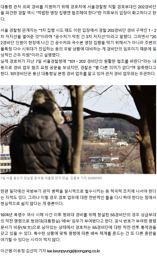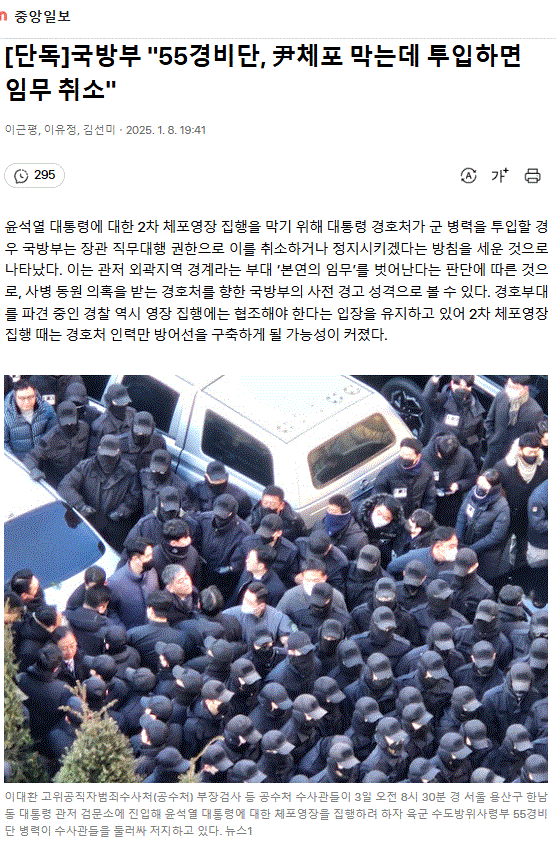 [단독] 국방부 "55경비단, 尹체포 막는데 투입하면 임무 취소"