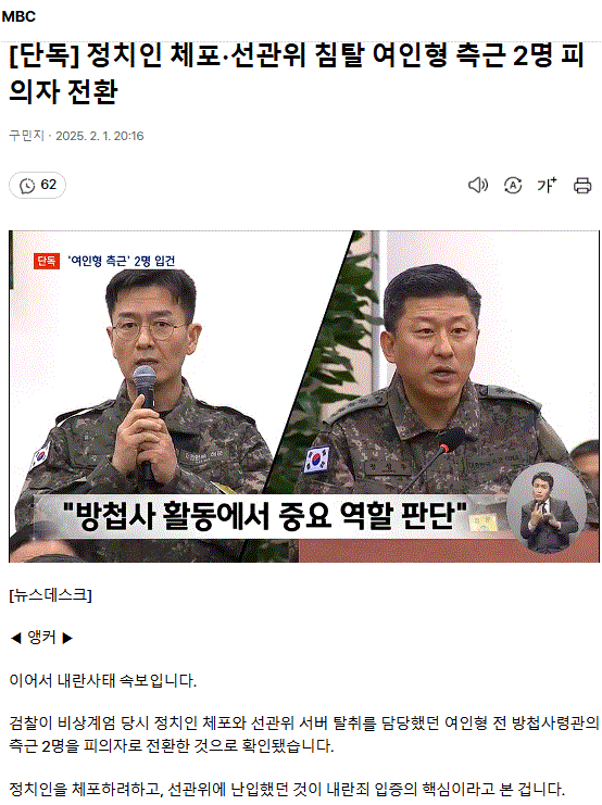[단독] 정치인 체포·선관위 침탈 여인형 측근 2명 피의자 전환