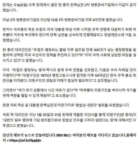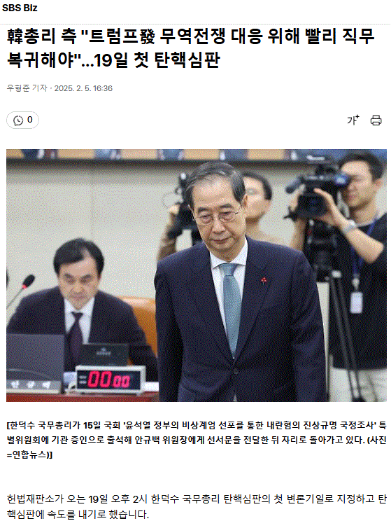 韓총리 측 "트럼프發 무역전쟁 대응 위해 빨리 직무복귀해야"… 19일 첫 탄핵심판 ㅡ 복귀해서 계엄하게