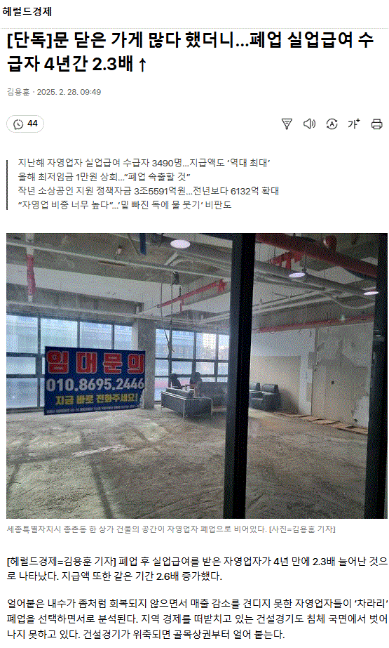 [단독] 문 닫은 가게 많다 했더니... 폐업 실업급여 수급자 4년간 2.3배↑