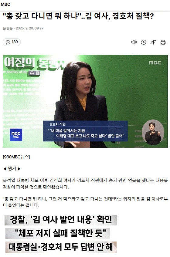 "총 갖고 다니면 뭐 하냐"‥ 김 여사, 경호처 질책?ㅡ 독재를 꿈꾸며 총기사용 교사한 거니