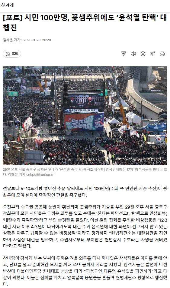 [포토] 시민 100만명, 꽃샘추위에도 ‘윤석열 탄핵’ 대행진