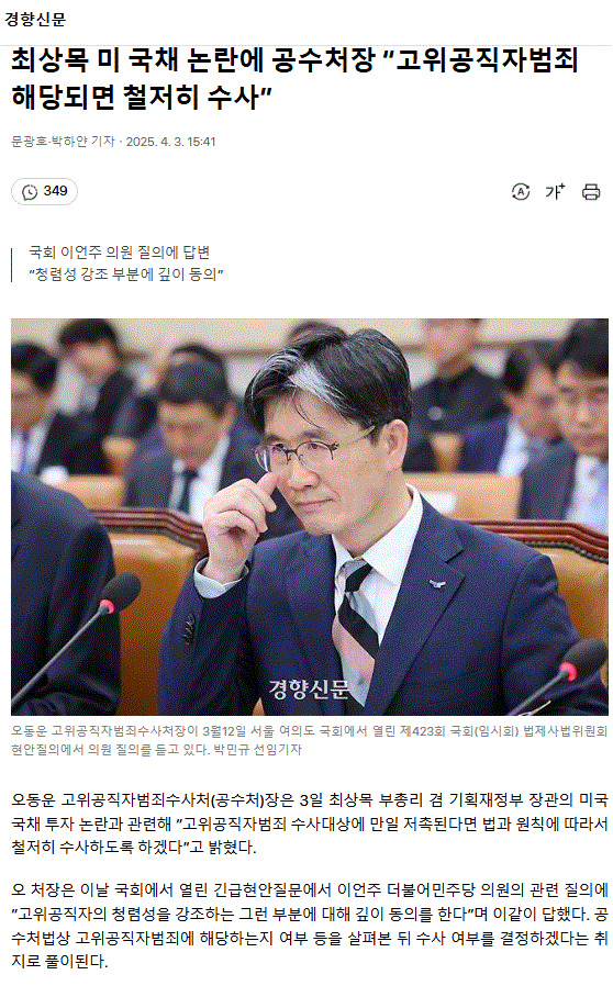 최상목 미 국채 논란에 공수처장 “고위공직자범죄 해당되면 철저히 수사”