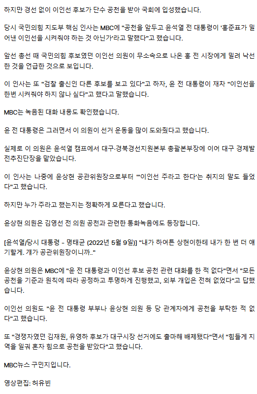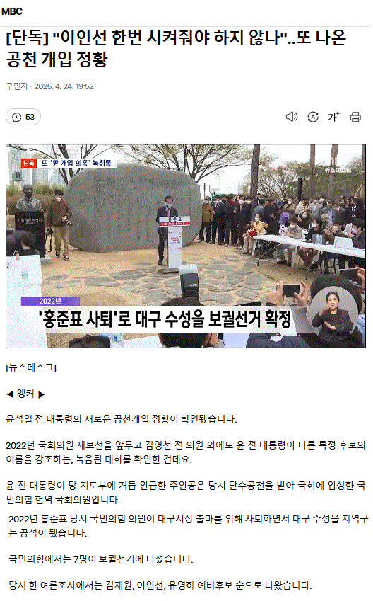 [단독] "이인선 한번 시켜줘야 하지 않나"‥ 또 나온 공천 개입 정황 ㅡ 윤석열을 구속하라