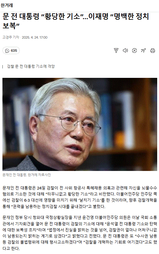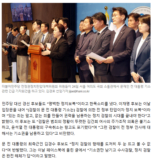 문 전 대통령 “황당한 기소”… 이재명 “명백한 정치 보복”ㅡ 윤석열을 구속하라