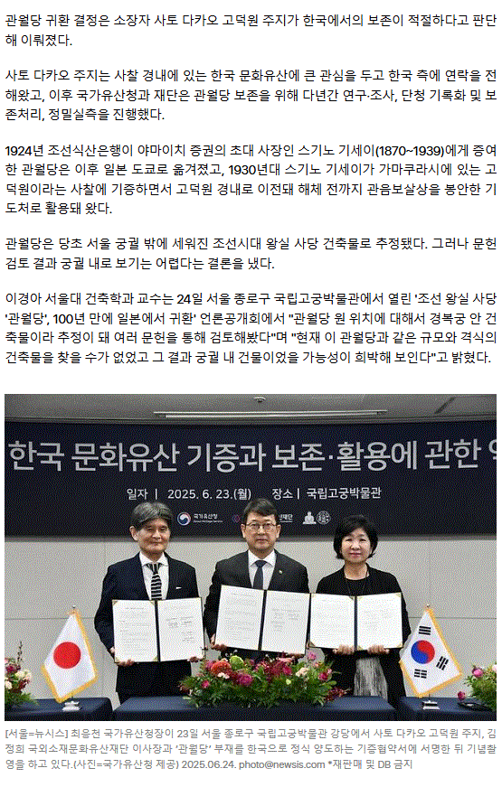 조선 왕실 사당 '관월당' 日 반출 100년 만에 고국 품으로 (종합)