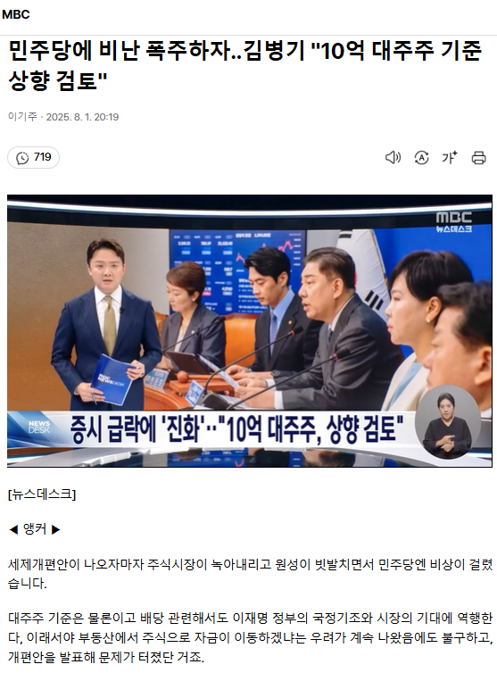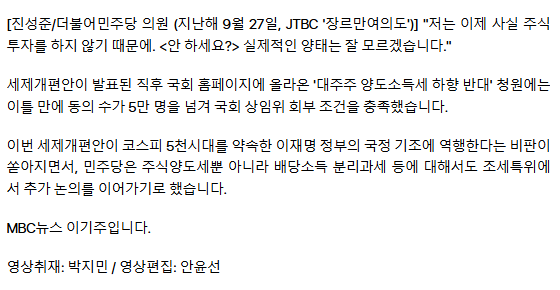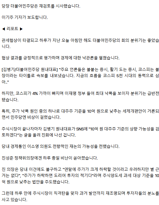 민주당에 비난 폭주하자‥ 김병기 "10억 대주주 기준 상향 검토"