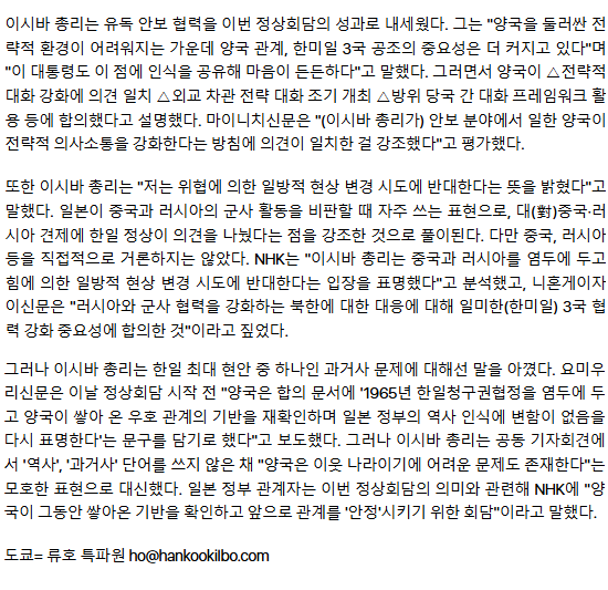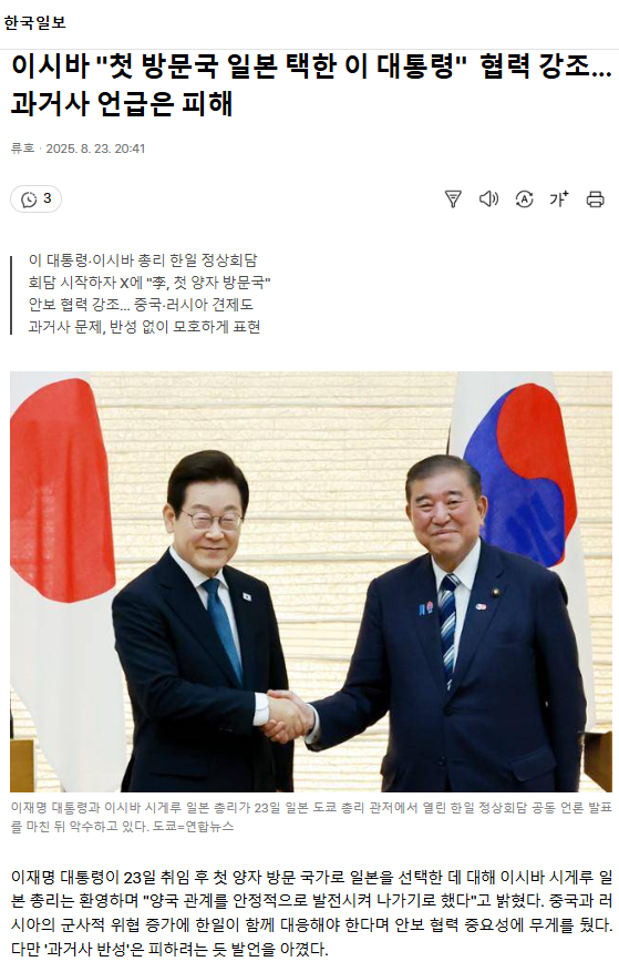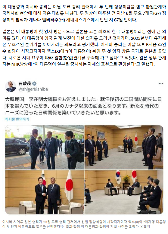 이시바 "첫 방문국 일본 택한 이 대통령" 협력 강조… 과거사 언급은 피해 ㅡ 일본의 사과가 먼저