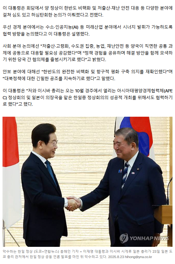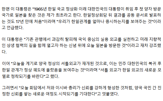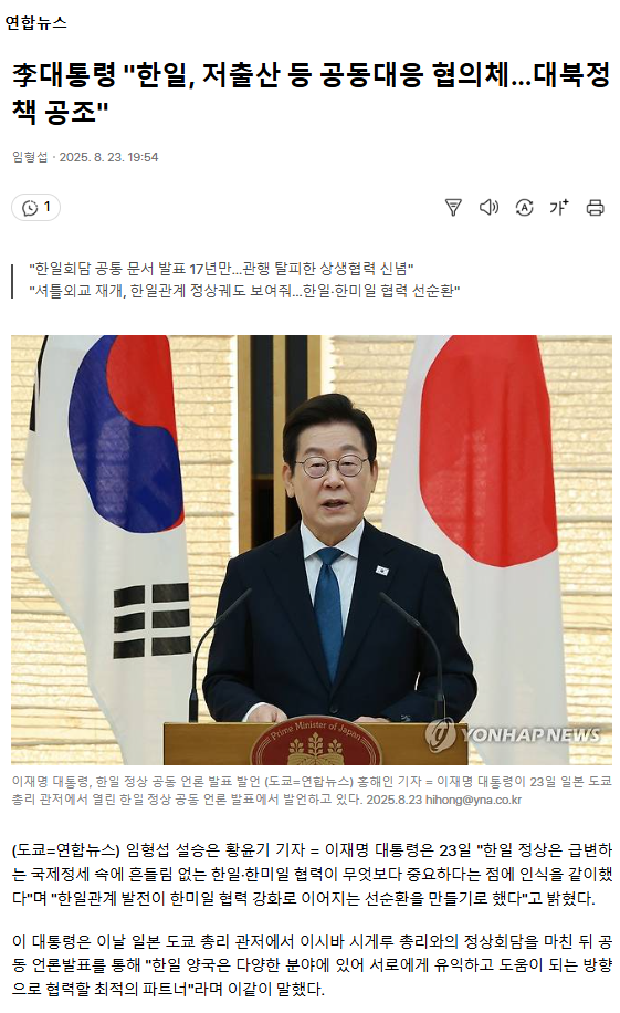 李대통령 "한일, 저출산 등 공동대응 협의체… 대북정책 공조" ㅡ 일본의 사과가 먼저