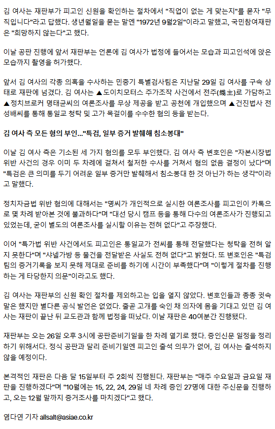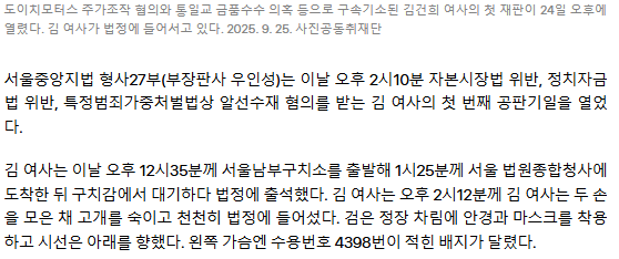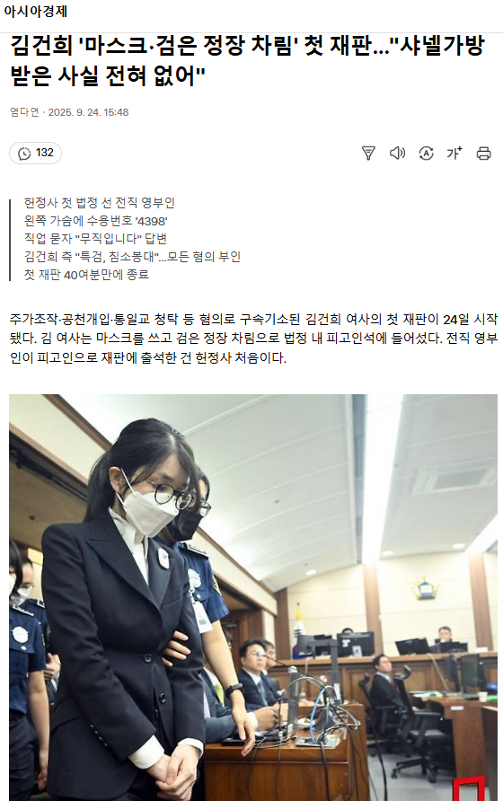김건희 '마스크·검은 정장 차림' 첫 재판… "샤넬가방 받은 사실 전혀 없어"