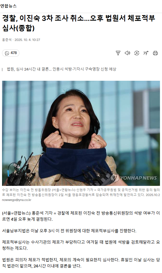 경찰, 이진숙 3차 조사 취소… 오후 법원서 체포적부심사 (종합) ㅡ 이진숙 구속하라