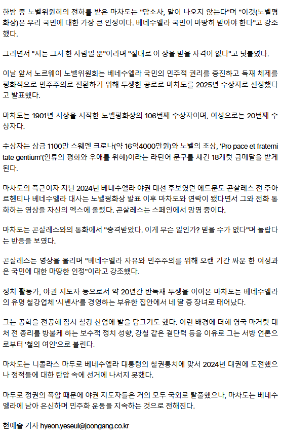 마차도, 한밤중 노벨상 소식에 "맙소사, 말 안 나와… 우린 승리할 것" ㅡ 트럼프 어쩌나