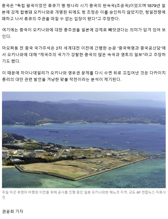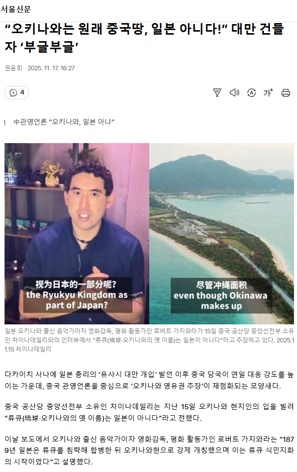 “오키나와는 원래 중국땅, 일본 아니다!” 대만 건들자 ‘부글부글’