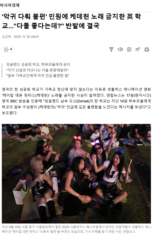'악귀 다뤄 불편' 민원에 케데헌 노래 금지한 英 학교… "다들 좋다는데?" 반발에 결국