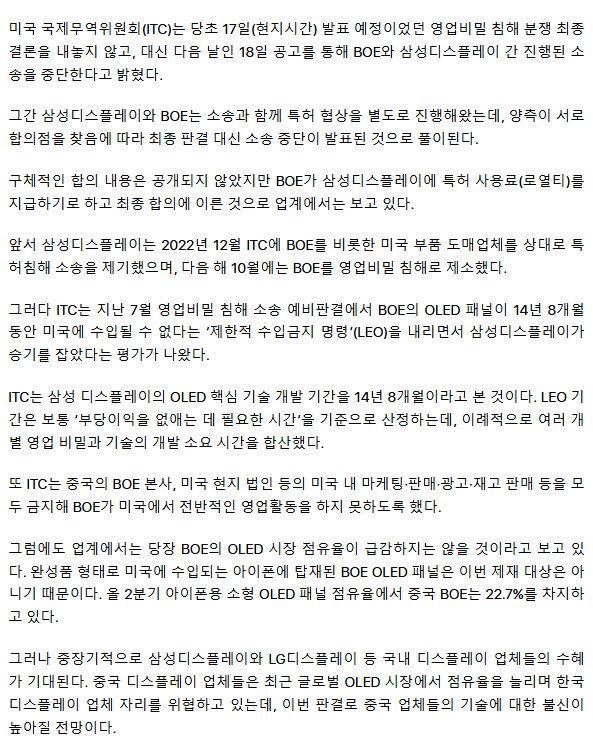 삼성D, 中 BOE 대상 OLED 기술분쟁 최종 승리