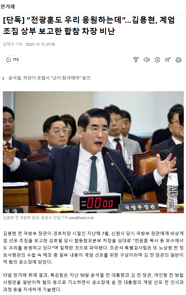 [단독] “전광훈도 우리 응원하는데”... 김용현, 계엄 조짐 상부 보고한 합참 차장 비난 ㅡ 강호필 차장