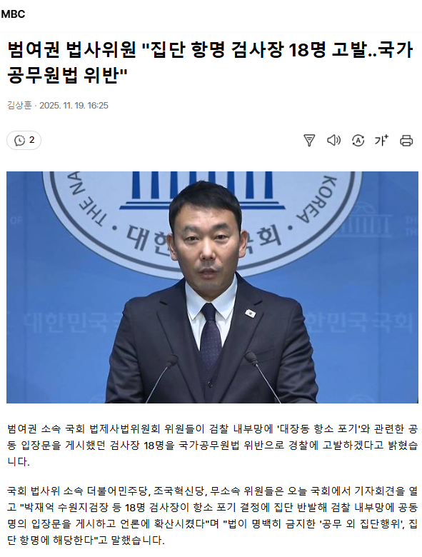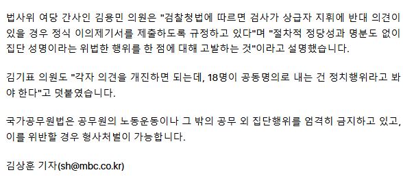 범여권 법사위원 "집단 항명 검사장 18명 고발‥ 국가공무원법 위반"ㅡ 검찰도 공무원
