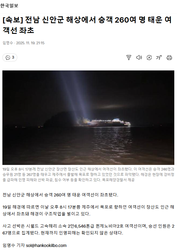 [속보] 전남 신안군 해상에서 승객 260여 명 태운 여객선 좌초