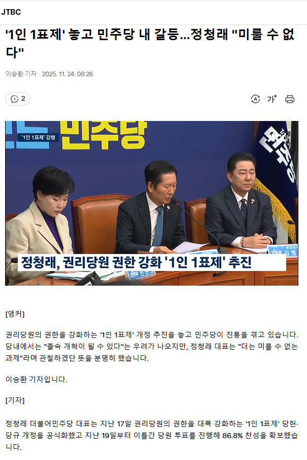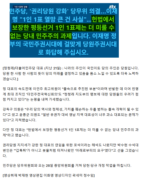 먼저해야할일은 조희대 탄핵하면서 내란전담 특별재판소 설치임!그담에 일인일표제는 숙의를거치고 시간적 여유를두고 여러당원들의 의견을 수렴하여 투명하게 과정을 공개하며 투표를 하는것이겠지요! 당헌당규를 고치는건 서두를 일이 아니에요 지금은 내란척결을 그리 중요하게 생각하면서 왜 뜬금없이 당헌 당규를 고치나요? 이는 내년 지선을 앞둔 정청래의 욕심이 빚어낸 분란이며 그속이 훤히 들여다 보인다는게 문제.. 당원들이 바보가 아닌이상 다알아요