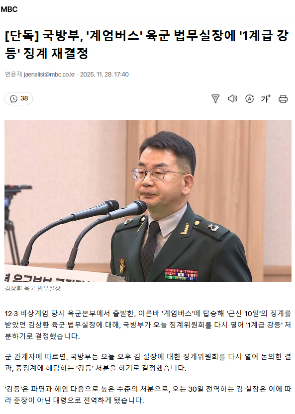 [단독] 국방부, '계엄버스' 육군 법무실장에 '1계급 강등' 징계 재결정