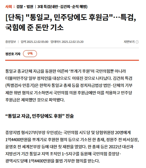 특검아 내로남불당 되지 않기위해 여당이든 야당이든 통일교에서 쪼개기
