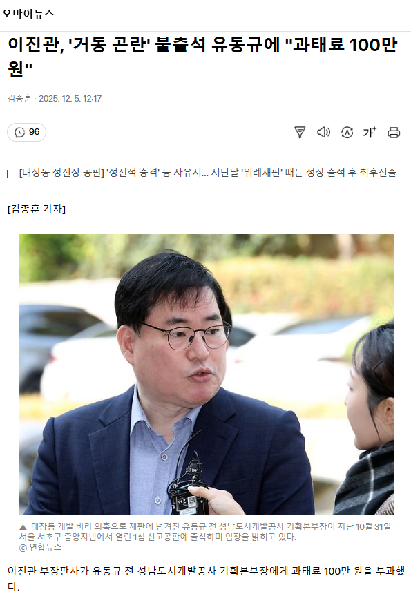 이진관, '거동 곤란' 불출석 유동규에 "과태료 100만 원"