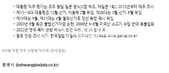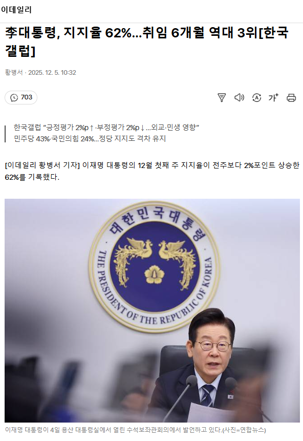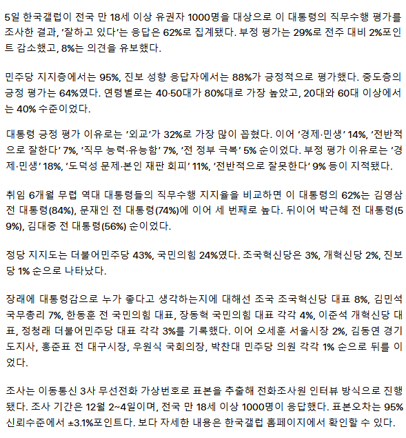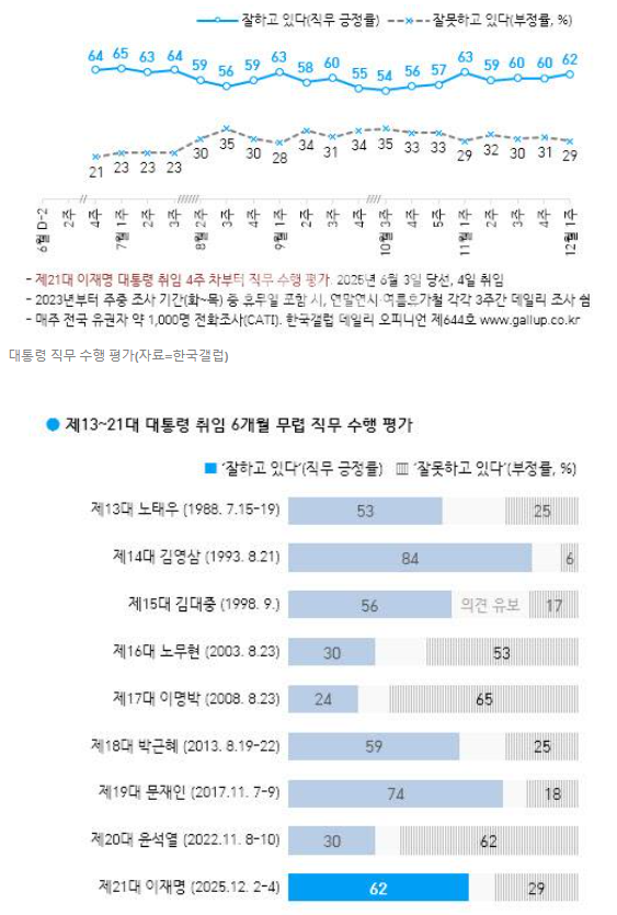 李대통령, 지지율 62%… 취임 6개월 역대 3위 [한국갤럽]