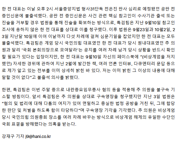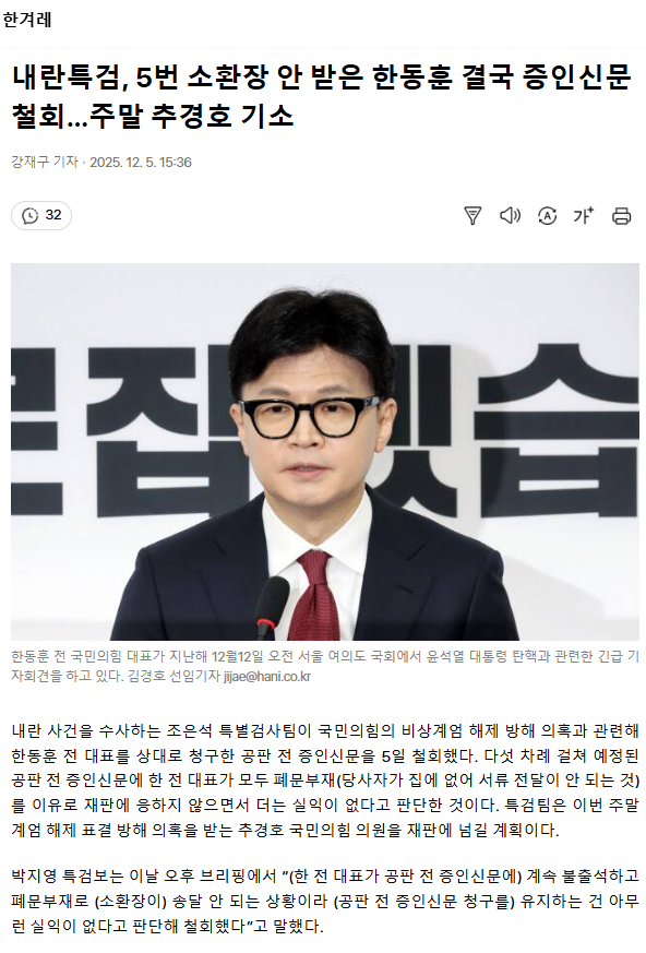 내란특검, 5번 소환장 안 받은 한동훈 결국 증인신문 철회… 주말 추경호 기소