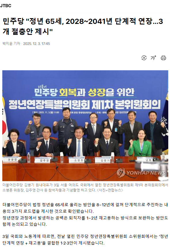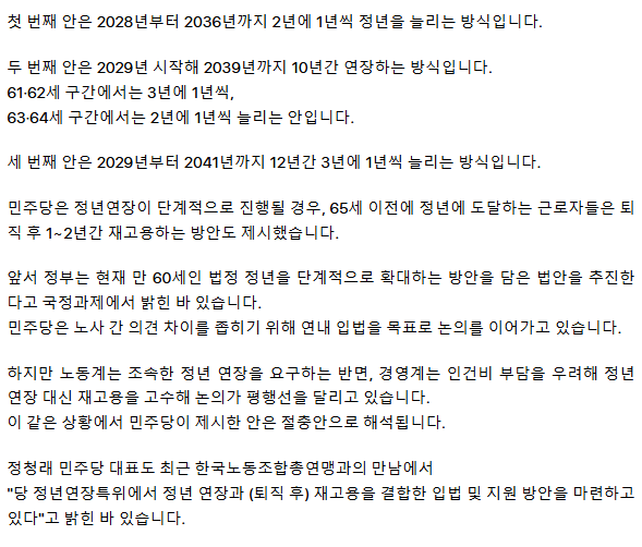 민주당 "정년 65세, 2028~2041년 단계적 연장… 3개 절충안 제시"