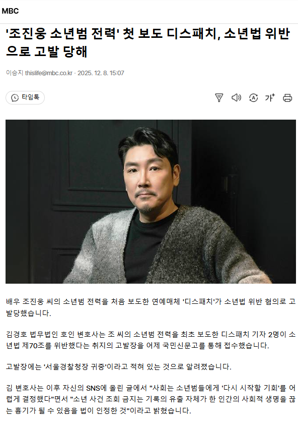 '조진웅 소년범 전력' 첫 보도 디스패치, 소년법 위반으로 고발 당해 ㅡ김경호 "소년법 제70조 위반 김소정, 구민지