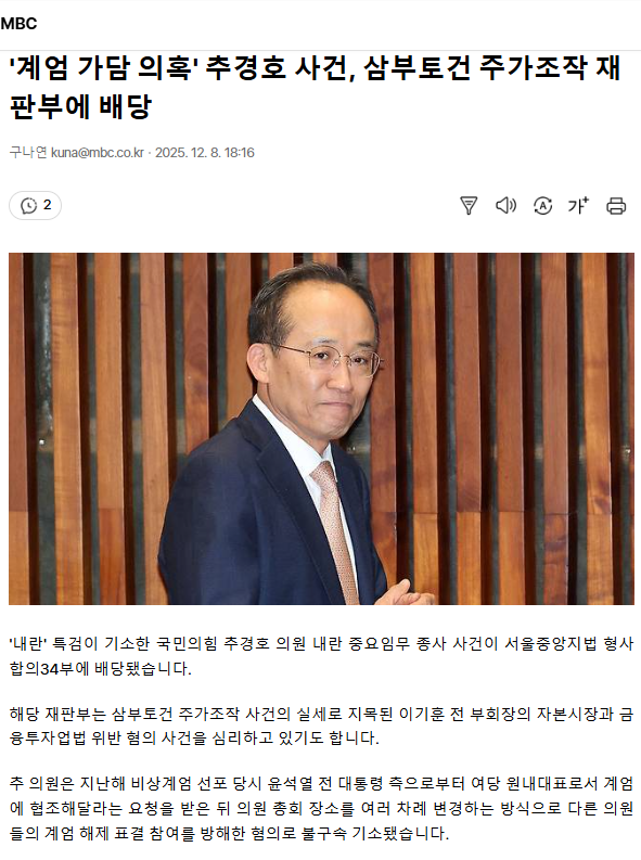 '계엄 가담 의혹' 추경호 사건, 삼부토건 주가조작 재판부에 배당 ㅡ서울중앙지법34부 한성진 판사