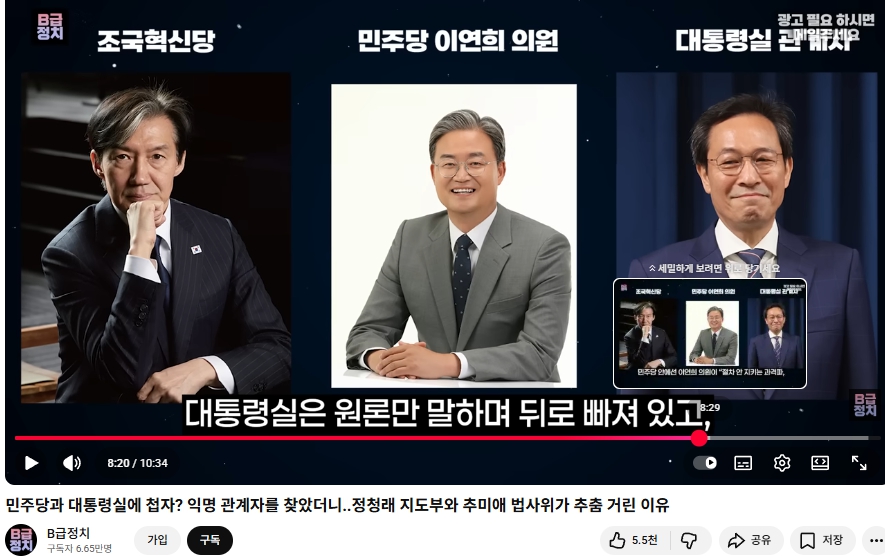 B급정치 유튭에서 조혁당 이연희의원 우상호정무수석을 개혁에 방해되는 인물들로 묘사를